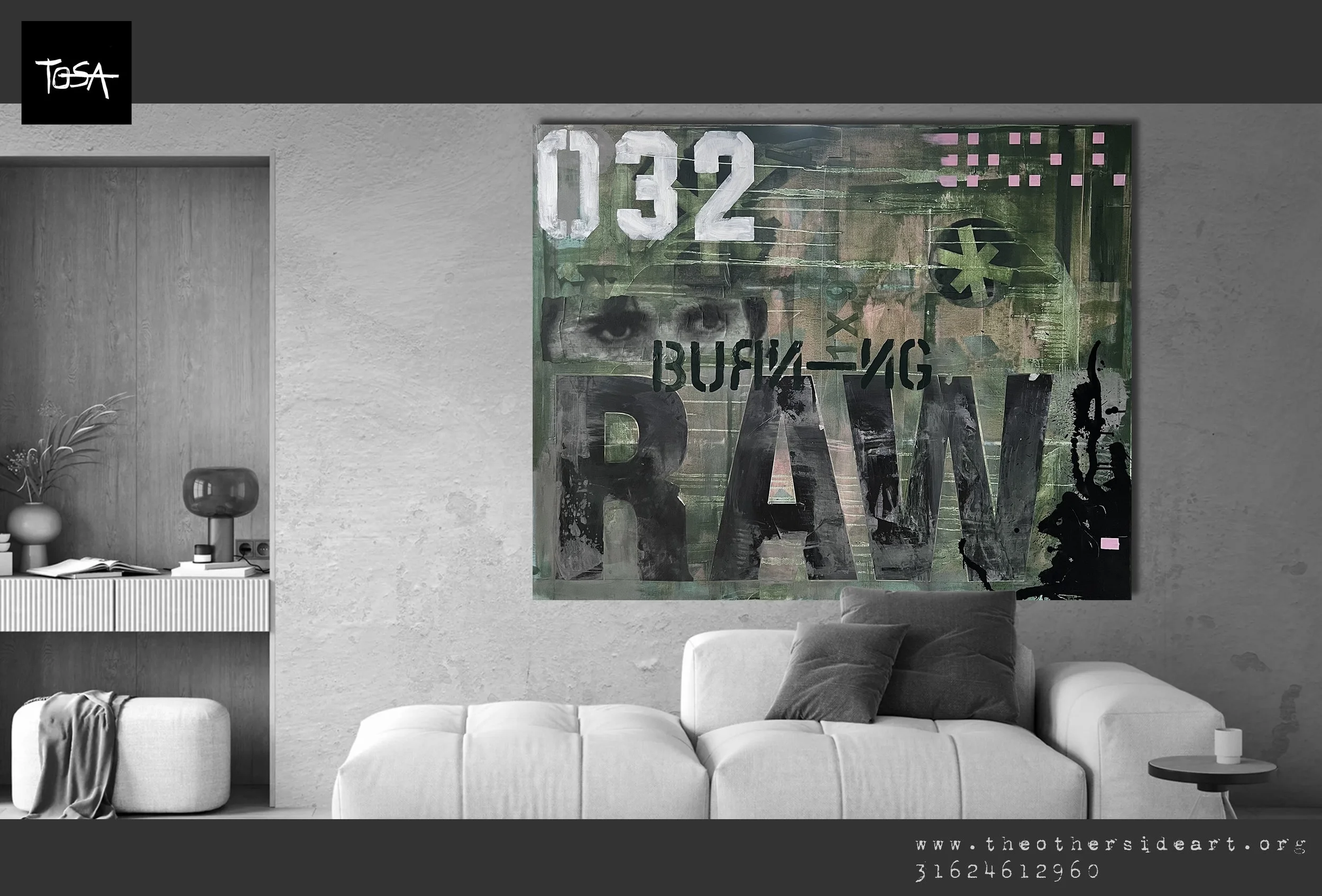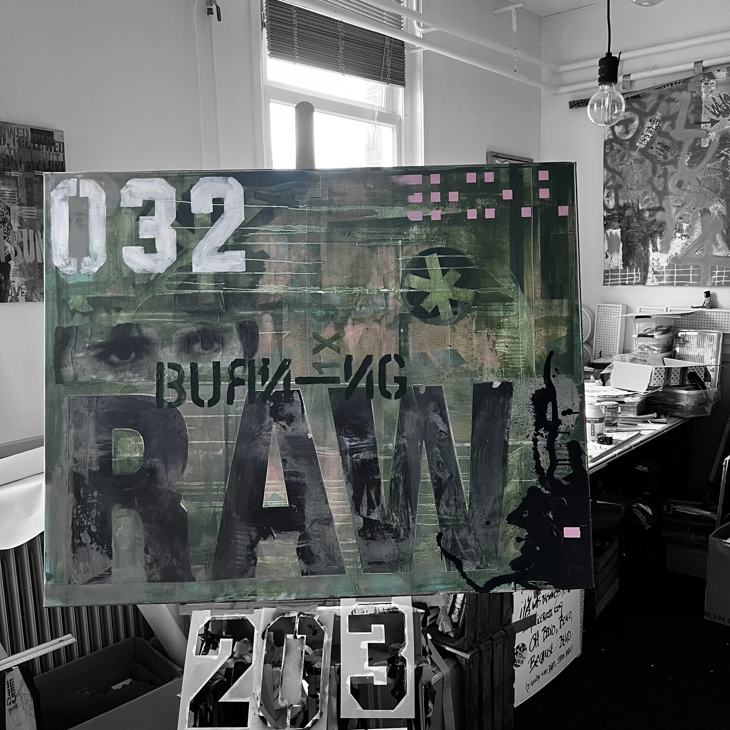 Canvas in frame / acryl verf / collage materiaal / spuitbusverf metaal / gebruikt karton / marker / potlood